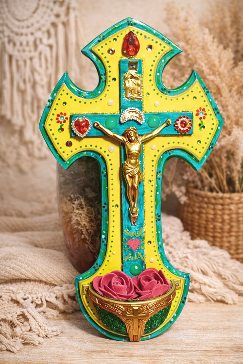 Bénitier jaune et vert avec roses rouge