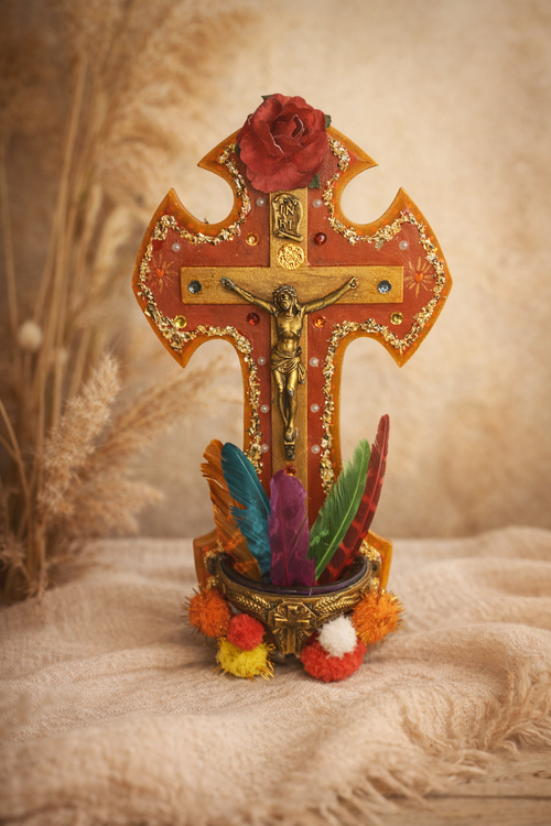 Bénitier orange, or et plumes